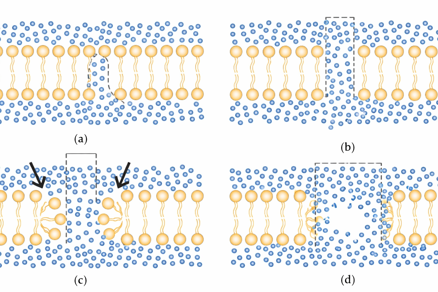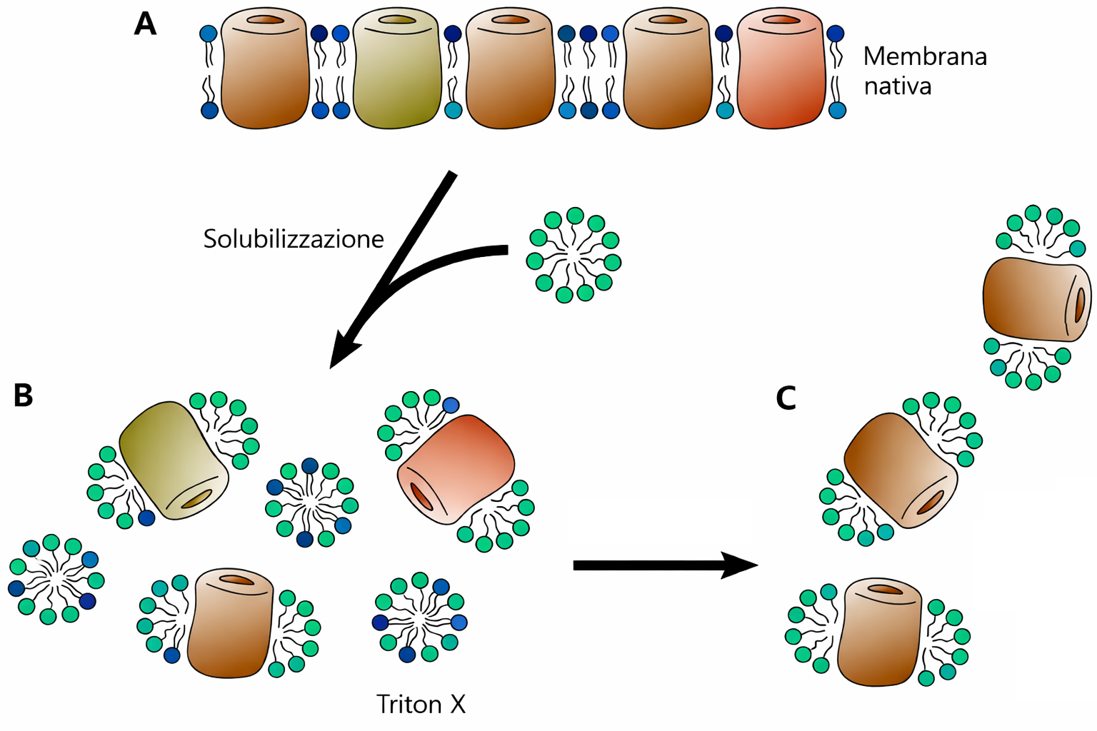 Quando membrane biologiche sono incubate con un eccesso di detergente, le code idrofobe del detergente si associano tanto alle superfici idrofobe delle proteine transmembrana quanto alle code aciliche dei fosfolipidi. Questo processo rompe le interazioni idrofobe cooperative che stabilizzano il doppio strato, portando alla formazione di complessi miscelle-proteina (proteina–detergente) e di micelle miste lipide–detergente, entrambi solubili in acqua (Figura 05.02-07). La porzione polare del detergente schermando le regioni idrofobe consente così di trasferire le proteine di membrana in soluzione, preservandone l’architettura di base e, spesso, l’attività: