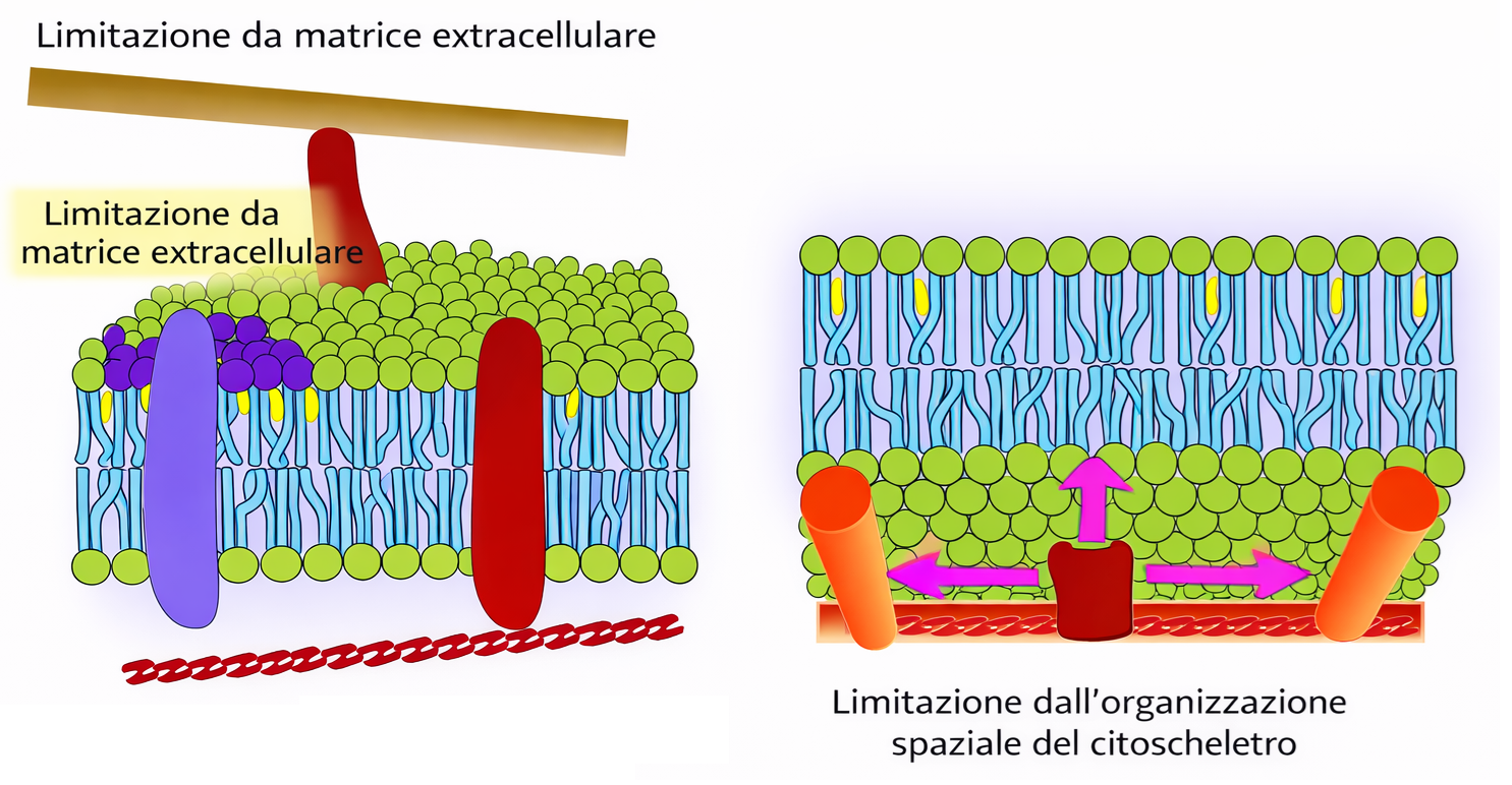 - oligomerizzazione e organizzazione in piattaforme molecolari o in microdomini lipidici ricchi di colesterolo e sfingolipidi, che riducono la diffusività locale.