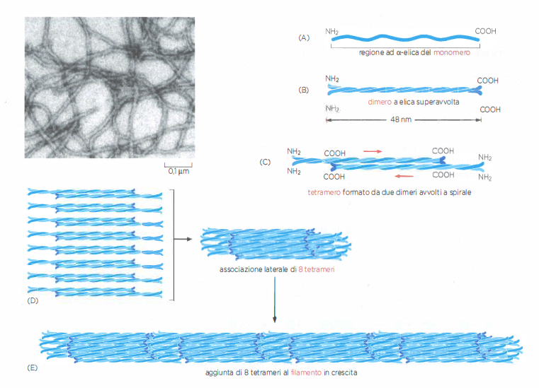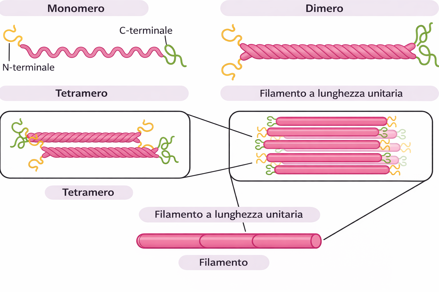Due dimeri disposti in orientamento opposto (antiparallelo) si associano formando un tetramero laterale privo di polarità intrinseca (Figura 05.27-02). I tetrameri, unità solubili chiave dell’assemblaggio, si allineano testa-coda lungo l’asse del filamento e, simultaneamente, interagiscono l’uno con l’altro su più registri laterali (Figura 05.27-02). La maturazione del filamento comporta l’impacchettamento di più tetrameri in una struttura cilindrica di circa 10 nm di diametro, comparabile a una corda composta da molteplici trefoli avvolti e sfalsati (Figura 05.27-02). In sezione trasversale il filamento comprende diverse decine di catene α-elicoidali, con un’elevata densità di contatti che conferisce robustezza al traliccio proteico.