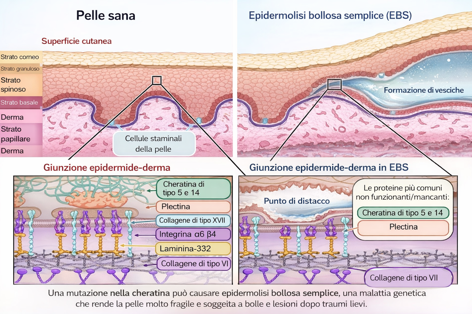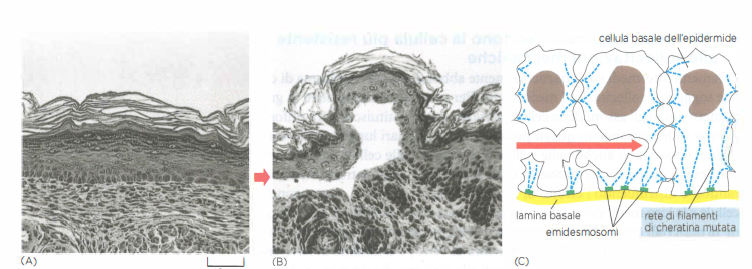 La rilevanza fisiologica di tale architettura è testimoniata dall’epidermolisi bollosa semplice: mutazioni in geni di cheratina dell’epidermide (tipicamente KRT5 o KRT14) compromettono l’assemblaggio dei filamenti intermedi e rendono la pelle estremamente fragile, così che anche un modesto trauma induce la formazione di bolle. Un fenotipo analogo si ottiene in topi transgenici che esprimono una cheratina mutante negli strati epidermici (Figura 05.27-04).