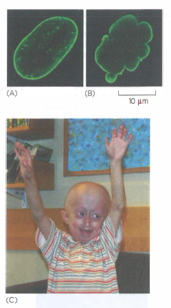 Mutazioni nelle lamine, specialmente nel gene LMNA, causano laminopatie, tra cui forme di progeria. Nella progeria di Hutchinson-Gilford, che rientra clinicamente nelle progerie, la produzione di una forma aberrante di lamina A (progerina) destabilizza il nucleo. I bambini affetti presentano pelle sottile e grinzosa, perdita precoce di capelli e denti e sviluppano con l’età alterazioni cardiovascolari severe (Figura 05.27-06). L’instabilità meccanica del nucleo e anomalie nell’organizzazione della cromatina possono compromettere la divisione cellulare, aumentare la morte cellulare e modificare l’espressione genica, contribuendo al quadro clinico.
