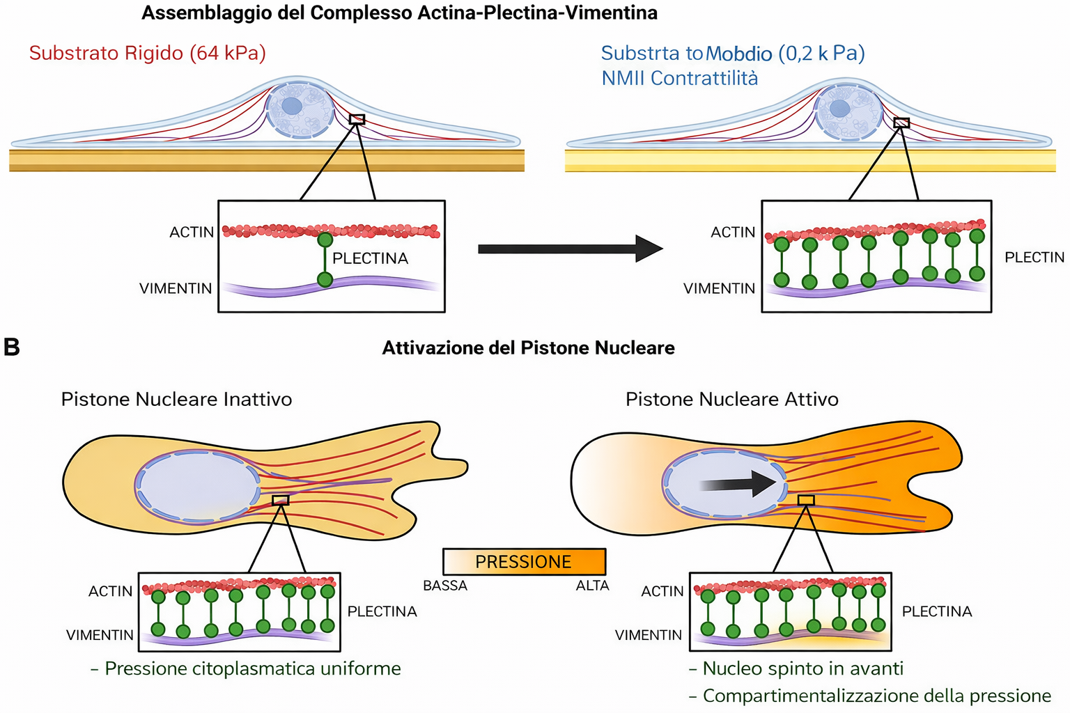 La continuità meccanica si estende fino al nucleo attraverso complessi proteici che attraversano l’involucro nucleare e accoppiano i citoscheletri citoplasmatici all’interno nucleare. Tali complessi, organizzati in sistemi LINC (Linker of Nucleoskeleton and Cytoskeleton), comprendono proteine SUN sulla membrana nucleare interna e proteine KASH/Nesprine sulla membrana esterna; insieme, si collegano alla lamina nucleare e a cromosomi da un lato e a microtubuli, actina e filamenti intermedi dall’altro. La plectina e altre proteine di ancoraggio si interfacciano con questi complessi, stabilendo ponti che coordinano la posizione del nucleo, il suo movimento durante la migrazione cellulare, la trasduzione meccanica e l’architettura globale del citoscheletro (Figura 05.27-08).