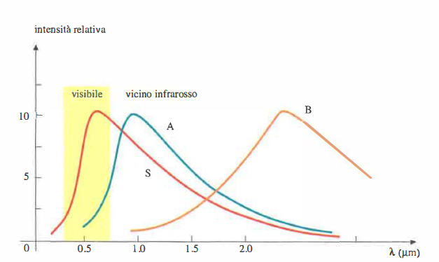 La sorgente più naturale di IR è l’emissione termica: qualunque corpo a temperatura \(T > 0\) K emette secondo la legge di Planck, con massimo spettrale determinato dalla legge di Wien, \( \lambda_{\max} T = b \), con \( b \approx 2{,}898 \times 10^{-3} \) m·K. Il Sole presenta il picco nel visibile, ma una quota rilevante dell’energia giunge in IR; come indicato in (Figura 07.21-02), l’atmosfera terrestre, per effetto dell’assorbimento da parte della CO₂ e del vapore acqueo, attenua significativamente l’IR oltre ~2 μm. Nella stessa (Figura 07.21-02) sono riportati gli spettri di due lampade impiegabili come sorgenti infrarosse: la lampada con temperatura di funzionamento maggiore mostra un’intensità superiore nel NIR (0,7–1,4 μm), in accordo con la legge di Wien. L’irraggiamento totale segue la legge di Stefan, \( M = \sigma T^4 \).