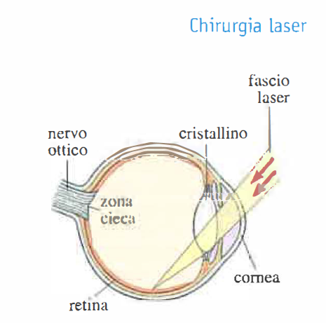 In Biologia e Medicina il laser trova applicazione nella spettroscopia ad assorbimento e fluorescenza, nella citofluorimetria a flusso, nell’attivazione fotochimica di molecole (ad esempio in fototerapia dinamica), nella fotocoagulazione e come microbisturi fino a scala cellulare. Un uso classico è in oftalmologia per prevenire il distacco di retina tramite fotocoagulazione (Figura 07.21-03). I precedenti fotocoagulatori a lampade ad arco generavano spot di 0,5–1,0 mm con maggiore dispersione termica e necessità di anestesia retrobulbare. L’impiego di laser consente impulsi brevi e spot dell’ordine di 50 μm o inferiori, concentrando l’energia su aree microscopiche con maggior precisione e, di norma, con sola dilatazione farmacologica dell’iride.