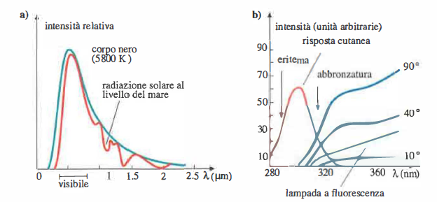 Gli UV, compresi tra le radiazioni ottiche, possono essere generati per emissione termica da sorgenti ad altissima temperatura o per eccitazione atomico-molecolare in gas rarefatti (scariche e archi elettrici). La sorgente naturale predominante è il Sole (Figura 07.21-05), approssimabile a un corpo nero di temperatura efficace circa 5.800 K. La legge di Wien, \( \lambda_{\mathrm{max}} T = b \), con \( b \approx 2{,}898 \times 10^{-3} \,\mathrm{m \cdot K} \), fornisce per la massima emissione \( \lambda_{\mathrm{max}} \approx 500 \,\mathrm{nm} \). Tuttavia, per effetto dell’assorbimento atmosferico, il massimo della distribuzione spettrale al suolo risulta spostato verso \( \lambda_{\mathrm{max}} \approx 600 \,\mathrm{nm} \) (Figura 07.21-05). Gli UV che raggiungono la superficie terrestre sono sostanzialmente quelli con \( \lambda \gtrsim 280 \,\mathrm{nm} \) (UVA e parte degli UVB).