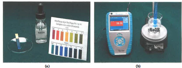 Il pH può essere determinato in modo approssimato o con elevata precisione. Una stima rapida si ottiene mediante carte indicatrici (indicatori universali), che cambiano colore al variare del pH. Per misure accurate si impiega il pH‑metro: un elettrodo vetroso sensibile a \( \mathrm{H_3O^+} \), accoppiato a un elettrodo di riferimento, rileva una differenza di potenziale elettrico proporzionale al pH secondo l’equazione di Nernst. Lo strumento va calibrato con soluzioni tampone certificate (ad esempio pH 4,00; 7,00; 10,00) per compensare deriva e dipendenza dalla temperatura. La dinamica di risposta dell’elettrodo, a 25 °C, è di circa 59,16 mV per unità di pH. Il principio operativo è illustrato nella (Figura 05.02-02).