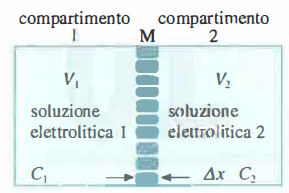 - se \(V_1 = V_2\), l’uguaglianza dei potenziali richiede \(C_1 = C_2\), in accordo con la diffusione libera descritta dalla legge di Fick;