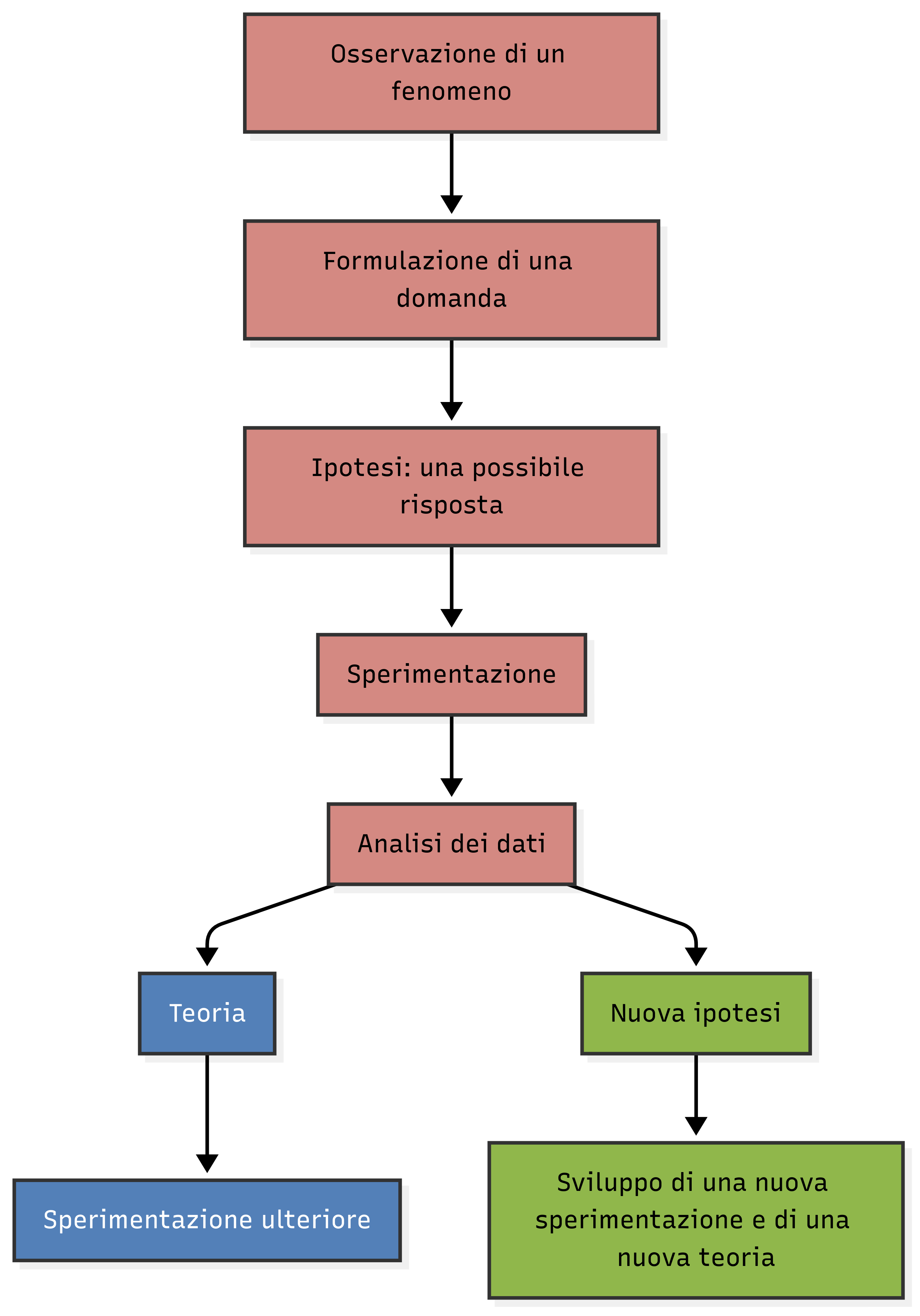 - Sviluppo di spiegazioni: proposta di un’ipotesi coerente con le osservazioni disponibili; se verificata da molteplici esperimenti indipendenti, l’ipotesi può evolvere in teoria, capace di unificare fatti noti e generare previsioni testabili;