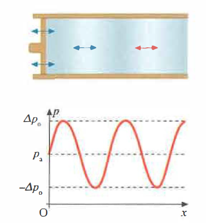 In un gas, le forze elastiche agenti sulle particelle (atomi o molecole) generano successioni di compressioni e rarefazioni: la perturbazione oscillatoria si manifesta quindi come un’alternanza di incrementi e decrementi locali di densità e pressione, che si propagano nel mezzo (Figura 04.17-01). Dal punto di vista dinamico ciò implica che il suono produce una variazione istantanea di pressione, che per un’onda armonica elementare segue un’andamento sinusoidale:
