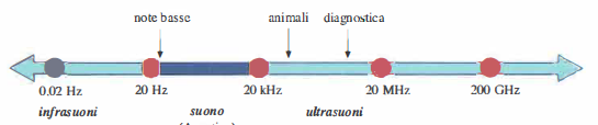 Si definiscono suoni le onde meccaniche percepibili dall’orecchio umano, con frequenza compresa tra 20 Hz e 20 kHz. Al di sotto di 20 Hz si parla di infrasuoni, al di sopra di 20 kHz di ultrasuoni (Figura 04.17-04). Per entrambe le classi valgono i fenomeni fisici discussi in precedenza: riflessione, rifrazione, interferenza e diffrazione; restano inoltre definite le grandezze fondamentali quali frequenza, lunghezza d’onda, velocità di propagazione, intensità e attenuazione.