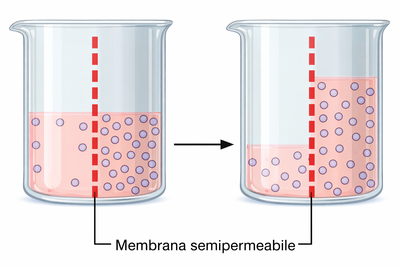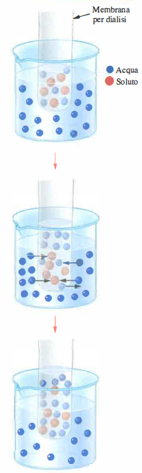 Si consideri una sacca da dialisi contenente una soluzione di glucosio 0,5 M, immersa in un becher con acqua pura. I pori della membrana lasciano passare l’acqua, ma non le molecole di glucosio. La concentrazione di glucosio è maggiore all’interno, ma il glucosio non può diffondere per annullare il gradiente; viceversa, la concentrazione di acqua è più alta all’esterno che all’interno, e pertanto l’acqua diffonde nella sacca secondo il suo gradiente. Il processo, rappresentato schematicamente in (Figura 03.04-02), prosegue finché la distensione della membrana genera una controforza sufficiente a bilanciare l’ingresso netto di acqua.