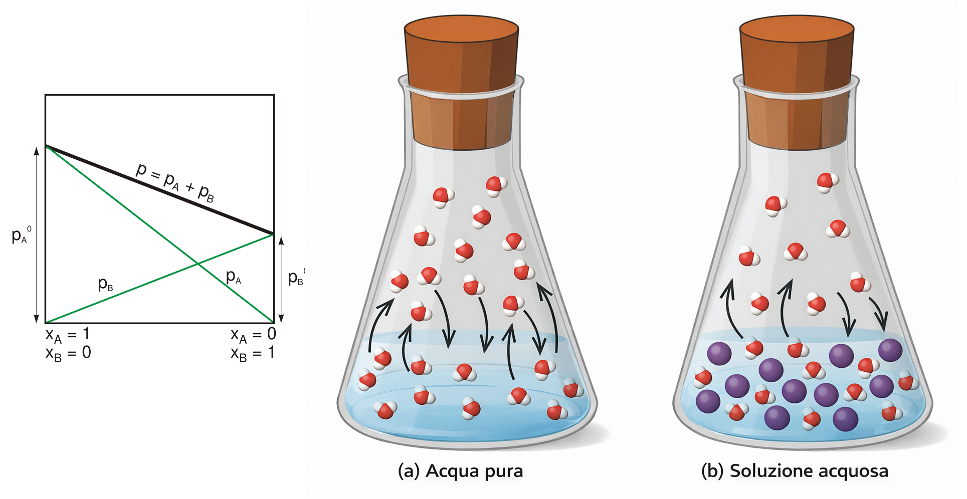 Una lettura molecolare del fenomeno chiarisce l’origine della diminuzione di pressione di vapore. L’evaporazione richiede che molecole di solvente lascino la superficie del liquido, raggiungendo lo stato di vapore sino all’equilibrio dinamico alla data temperatura. Le particelle di soluto, occupando siti alla superficie e alterando la distribuzione delle energie, riducono il numero di molecole di solvente che riescono a sfuggire per unità di tempo; la pressione di vapore di equilibrio risulta quindi inferiore rispetto al solvente puro (Figura 03.04-01). Per contro, all’aumentare della temperatura cresce la pressione di vapore della soluzione finché uguaglia la pressione esterna: ciò richiede una temperatura maggiore rispetto al solvente puro, come discusso più avanti.