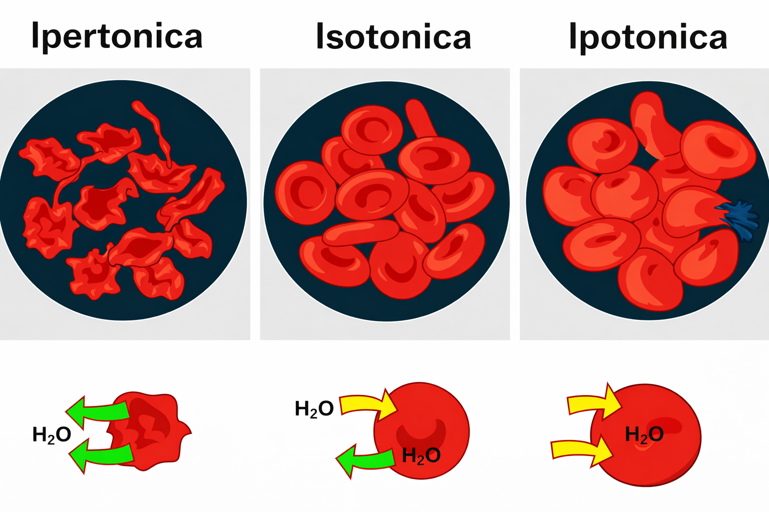 Questi concetti hanno ricadute cliniche immediate nella scelta dei fluidi infusionali (Figura 03.04-04). Un liquido endovenoso deve risultare isotonico rispetto al plasma e agli eritrociti per non alterare il bilancio idrico tra compartimento intravascolare e cellule. Sono comunemente impiegate soluzioni di destrosio (glucosio) al 5,5% in massa/volume, pari a circa 0,30 M, e soluzioni saline “normali” allo 0,9% di NaCl, corrispondenti a circa 0,15 M: entrambe presentano, a temperatura fisiologica, una pressione osmotica prossima a quella del plasma e possono essere somministrate senza indurre variazioni significative del volume eritrocitario.
