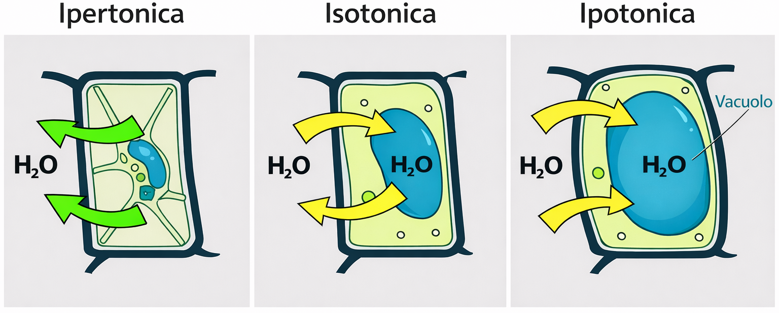 Per completezza, si riassumono alcune equivalenze utili al calcolo: una soluzione 1,0 M di glucosio fornisce 1,0 osmol/L; una soluzione 1,0 M di NaCl fornisce idealmente 2,0 osmol/L; una soluzione 1,0 M di CaCl\(_2\) apporta idealmente 3,0 osmol/L. In pratica, a concentrazioni non infinitesimali si osservano scostamenti dovuti a interazioni ioniche, ma per scopi fisiologici e didattici le approssimazioni ideali risultano spesso adeguate.