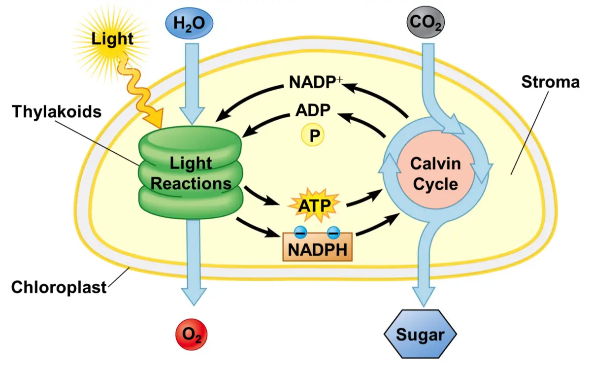 - flusso di energia: fotoni solari sono convertiti in energia chimica (ATP, NADPH) e poi immagazzinati in legami C–C e C–H degli zuccheri;