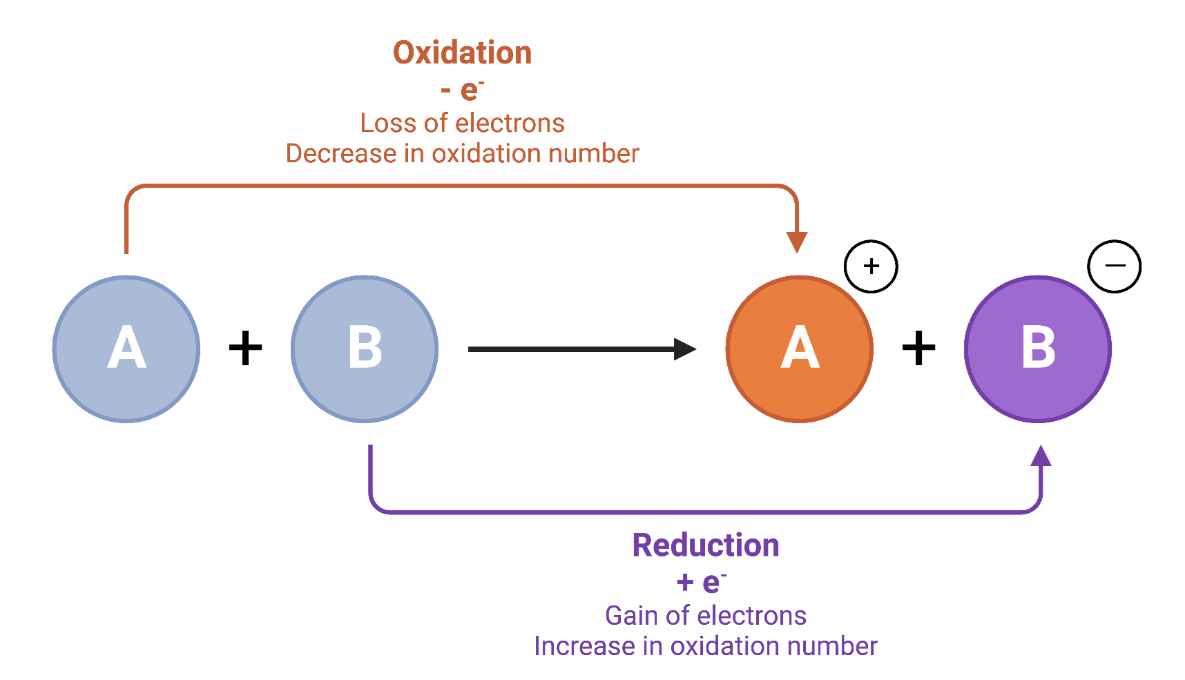 Nelle cellule, l’ossidazione dei composti organici non coincide necessariamente con un legame diretto all’ossigeno; più in generale, una specie chimica si ossida quando perde elettroni e si riduce quando li acquista. Poiché gli elettroni si conservano, ogni ossidazione è accoppiata a una riduzione, dando luogo a una reazione di ossidoriduzione. La terminologia storica “riduzione” deriva dal fatto che, in antichi processi metallurgici, la rimozione di ossigeno dai minerali ne “riduceva” la massa.