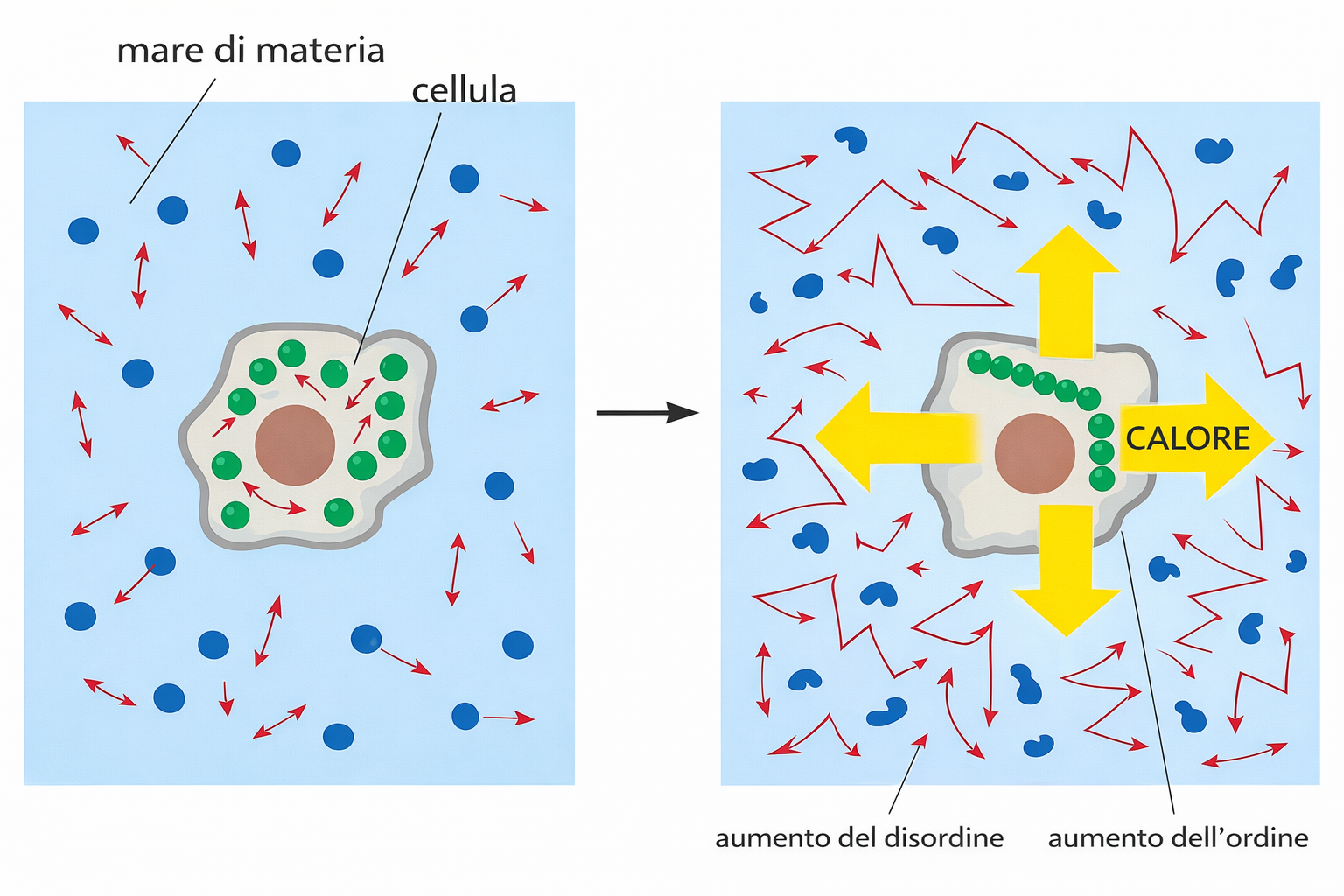 La condizione termodinamica che rende possibile l’ordine biologico è riassunta da: \[ \Delta S_{\text{tot}} = \Delta S_{\text{cellula}} + \Delta S_{\text{ambiente}} \ge 0, \] dove \(\Delta S_{\text{cellula}}\) può essere negativo quando la cellula ordina la propria materia, ma è più che compensato da \(\Delta S_{\text{ambiente}} \approx \frac{Q}{T}\), con Q il calore rilasciato alla temperatura T. In altre parole, l’aumento di entropia del contesto deve superare la diminuzione interna affinché il bilancio complessivo resti non negativo, come richiesto dalla seconda legge: