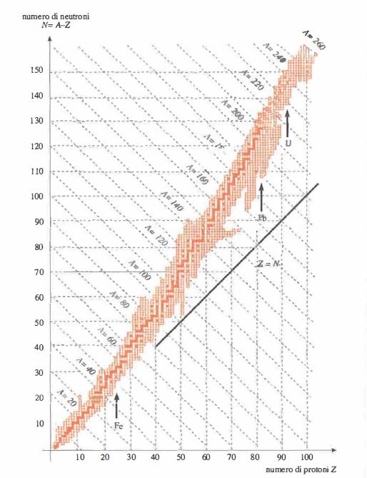 Nel nucleo atomico coesistono due interazioni di natura diversa: l’attrazione a corto raggio dovuta alla forza nucleare forte, che lega tra loro nucleoni (protoni e neutroni), e la repulsione coulombiana tra protoni, che cresce con il numero atomico Z. All’aumentare di Z, la repulsione elettrica diviene preponderante su scale nucleari sempre più ampie; la stabilità è allora garantita solo da un eccesso relativo di neutroni, i quali contribuiscono al legame senza introdurre repulsione elettrica. Se si rappresentano tutti i nuclidi nel piano numero atomico Z–numero di neutroni N, si ottiene l’andamento mostrato in (Figura 07.16-01): la “striscia di stabilità” devia progressivamente dalla bisettrice N = Z e presenta una pendenza maggiore di 1, evidenziando che per valori elevati di Z sono necessari più neutroni per mantenere il nucleo legato.