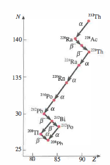 Un esempio significativo è la serie di decadimenti del torio \(^{232}\mathrm{Th}\), che procede attraverso molte tappe con emissioni α e β fino a raggiungere un nuclide stabile; la successione è illustrata in (Figura 07.16-02). In tali catene, ogni stadio ridisegna il bilancio tra N e Z, avvicinando progressivamente il nucleo alla regione di stabilità.