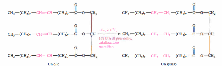 Conversione di un olio (la trioleina) in un grasso (la tristearina) mediante un processo di idrogenazione.