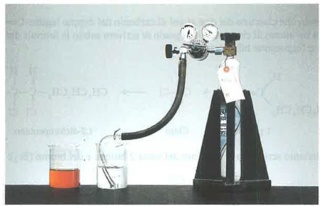 Bromurazione di un alchene: la soluzione a sinistra è rossa per la presenza di bromo e denota l’assenza di alcheni o alchini. In presenza di un idrocarburo insaturo, il bromo viene consumato dalla reazione e la soluzione risultante è incolore (a destra).