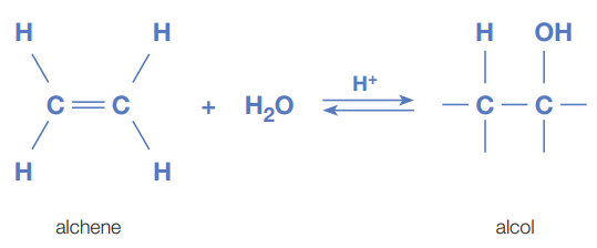 Come discusso per gli alcheni, le reazioni di addizione al doppio legame costituiscono una via privilegiata per ottenere alcoli. L’addizione di acqua a un alchene in presenza di un catalizzatore acido (idratazione acido-catalizzata) genera un carbocatione intermedio e segue la regola di Markovnikov: il protone si aggiunge all’atomo di carbonio più ricco di idrogeni, mentre il gruppo –OH si lega al carbonio più sostituito. Ne risulta il prodotto derivante dal carbocatione più stabilizzato. In forma schematica: