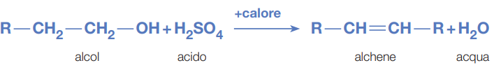 | Formazione di alcheni. Gli alcheni si possono preparare per disidratazione di un alcol in ambiente acido con somministrazione di calore. |