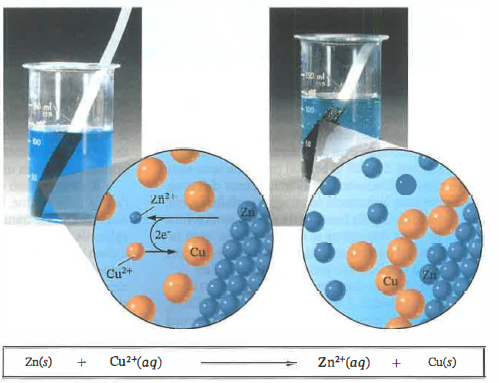 Se una lamina di zinco metallico viene immersa in una soluzione acquosa contenente ioni rame(II), gli atomi di zinco si ossidano a ioni Zn²⁺, mentre gli ioni Cu²⁺ si riducono a rame metallico che si deposita sulla superficie dello zinco (Figura 05.06-01). Il bilancio redox complessivo è: