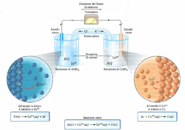 - ponte salino: contiene un elettrolita inerte ad alta mobilità ionica, non reattivo con le semicelle, e impedisce il mescolamento diretto delle soluzioni pur consentendo il passaggio di carica.