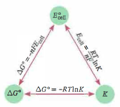 Conoscendo una qualunque tra \( \Delta G^\circ \), \( E^\circ_{\mathrm{cell}} \) e \( K \), le altre due si determinano con le formule riassunte in (Figura 05.06-04) e (Tabella 05.06-02).