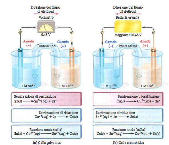 Per elettrolisi si intende l’impiego di energia elettrica esterna per forzare una reazione redox termodinamicamente non spontanea. Le batterie ricaricabili alternano due modalità: durante l’erogazione di corrente si comportano da celle galvaniche, mentre durante la ricarica il caricabatterie impone una differenza di potenziale opposta che inverte il flusso elettronico e rigenera i reagenti, attuando un processo elettrolitico. La (Figura 05.06-06) illustra il nesso tra funzionamento galvanico ed elettrolitico in una pila ricaricabile stagno/rame.
