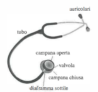 L’introduzione dell’auscultazione mediata si deve a René T. H. Laennec, che nei primi anni dell’Ottocento impiegò un cilindro cavo in legno denominato “stetoscopio”. Il dispositivo contemporaneo integra una testina con campana, talora dotata di diaframma, un sistema di tubi flessibili e una coppia di auricolari che convoglia l’energia sonora verso il timpano dell’operatore (Figura 04.21-01).