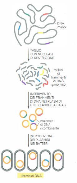 Le tecnologie di sequenziamento di nuova generazione (NGS) hanno introdotto il concetto di lettura massivamente parallela, consentendo l’analisi simultanea di milioni di molecole. La preparazione delle librerie avviene senza passaggi clonali in batteri (Figura 04.09-04): il DNA genomico viene frammentato, le estremità sono riparate e sono aggiunti adattatori necessari per l’ancoraggio al supporto e per l’amplificazione. Ogni frammento è immobilizzato su un substrato solido (per esempio un vetrino funzionalizzato) o su una biglia; un’amplificazione in situ (per es. bridge amplification o PCR in emulsione) genera, in prossimità dello stampo, un insieme di copie identiche, formando un gruppo di molecole \( \approx 10^3 \) per sito. I gruppi vengono quindi letti in parallelo.