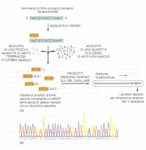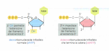 Alla fine degli anni ’70, il metodo a terminazione di catena (sequenziamento Sanger) ha reso possibile determinare con affidabilità la sequenza di frammenti di DNA purificati. Il principio si basa sull’impiego di dideossiribonucleosidi trifosfato (ddNTP), privi del gruppo 3’-OH: l’incorporazione di un ddNTP da parte della DNA polimerasi impedisce l’ulteriore estensione del filamento, generando prodotti che terminano in ogni posizione della sequenza bersaglio (Figura 04.09-01). A partire da un primer che ibrida sul DNA stampo, si ottiene così una popolazione di frammenti terminanti con A, C, G o T in tutti i punti possibili.