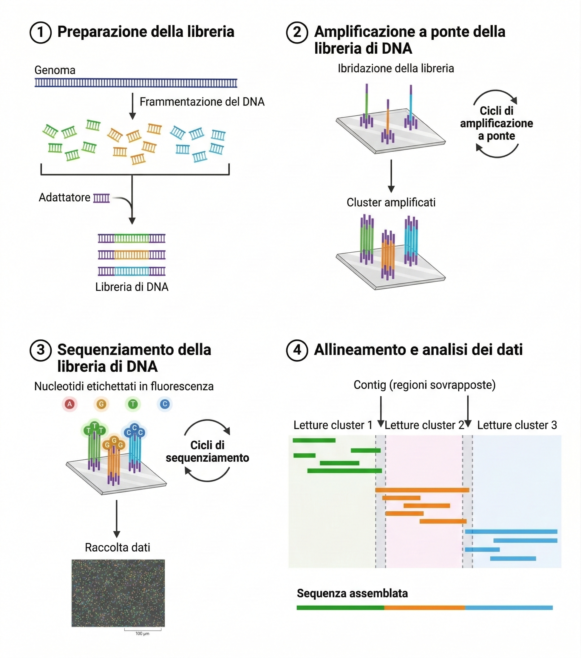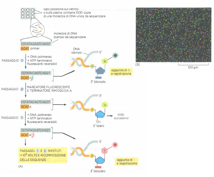 Una piattaforma ampiamente utilizzata è Illumina. Il ciclo di chimica si fonda su nucleotidi terminatori reversibili con etichette fluorescenti distinte: a ogni passo, la DNA polimerasi incorpora un singolo nucleotide modificato, si acquisisce un’immagine dell’intero vetrino per identificare, gruppo per gruppo, quale base è stata aggiunta, e poi si rimuovono il blocco e il fluoroforo per permettere il ciclo successivo (Figura 04.09-03). La molteplicità di reazioni in parallelo consente di sequenziare, in settimane, molti genomi con costi contenuti: