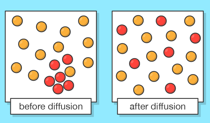 I gas si mescolano e diffondono rapidamente: le particelle, muovendosi in tutte le direzioni, esplorano efficacemente lo spazio disponibile. La dipendenza dalla massa è colta dalla legge di Graham, secondo cui il tasso di diffusione (o effusione) è inversamente proporzionale alla radice quadrata della massa molare: \( r \propto 1/\sqrt{M} \). Molecole leggere diffondono più velocemente di quelle pesanti, in accordo con l’illustrazione in (Figura 02.01-02).