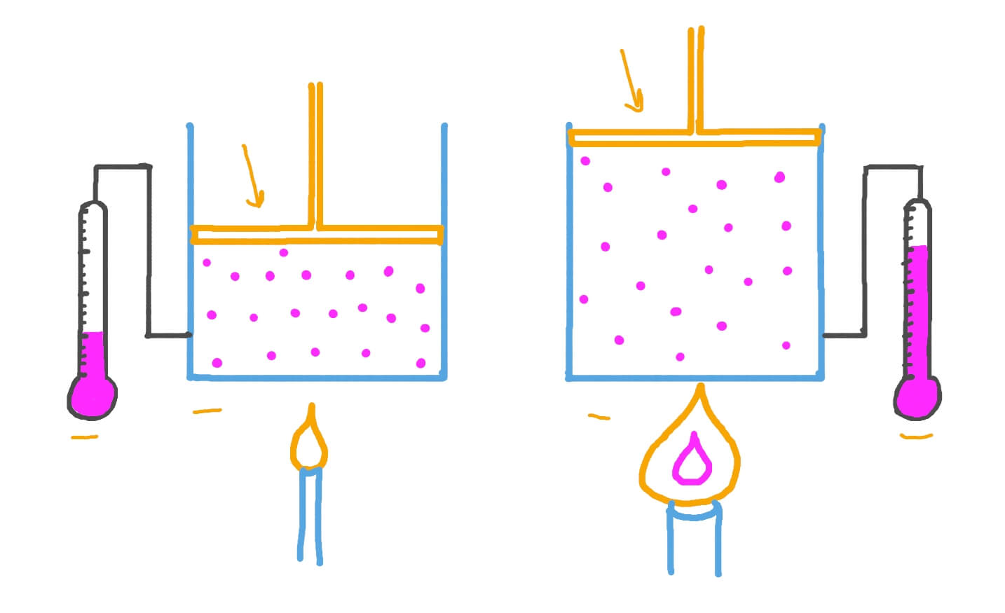 La pressione esercitata su superfici e pareti deriva dagli urti delle particelle: l’incremento del numero di urti al secondo e/o della loro intensità, dovuto a temperature maggiori o volumi minori, accresce \( P \) in modo prevedibile dal modello cinetico.