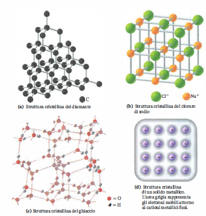 - Solidi metallici: composti da nuclei positivi immersi in un “gas” di elettroni delocalizzati; la sovrapposizione di orbitali genera bande elettroniche parzialmente occupate, responsabili di elevata conducibilità elettrica e termica; la malleabilità e la duttilità derivano dallo scorrimento dei piani cristallini senza rottura del legame metallico; struttura cristallina (cubica a corpo centrato, cubica a facce centrate, esagonale compatta), purezza e presenza di leghe (per esempio rame, argento, ottone) modulano le proprietà meccaniche e fisiche.