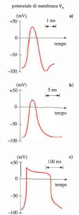 In (Figura 06.18-01) sono confrontati i potenziali d’azione di neuroni, muscolo scheletrico e miocardio: la diversa morfologia dell’onda e la durata dell’evento riflettono le proprietà specifiche di membrana, in particolare la composizione dei canali ionici e la cinetica delle correnti.