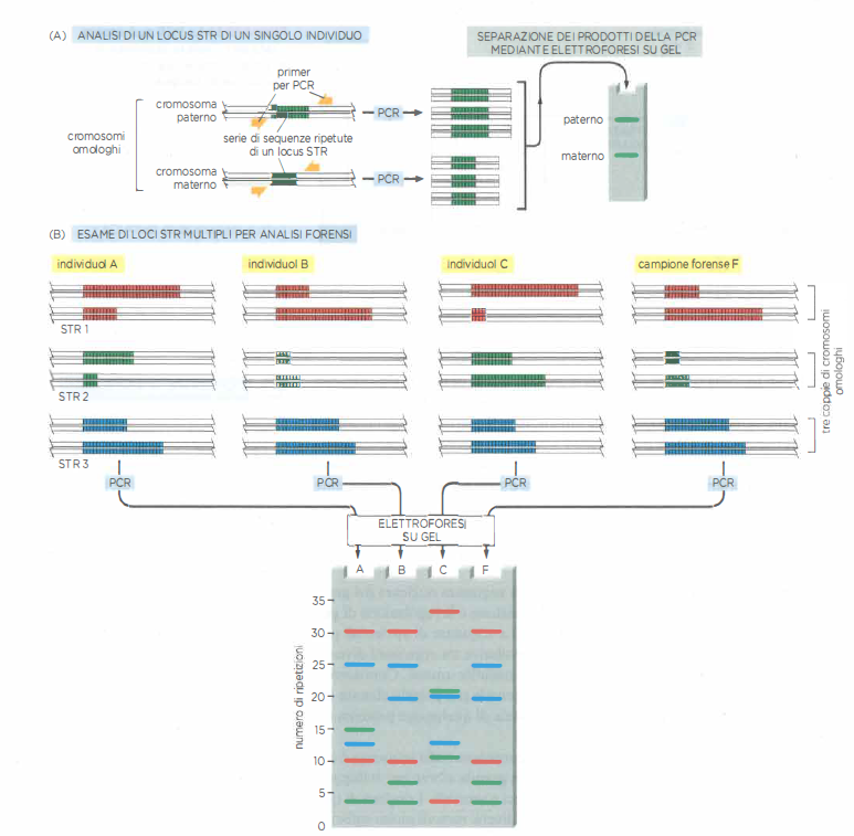 In ambito forense, la straordinaria sensibilità della PCR consente la genotipizzazione a partire da quantità minime di materiale biologico, quali un singolo bulbo pilifero o cellule epiteliali su un oggetto. L’analisi di loci altamente polimorfici, tipicamente brevi ripetizioni in tandem (STR), mediante multiplex PCR produce un profilo unico della persona cui appartiene il DNA, esclusi i gemelli monozigoti (Figura 04.08-05). L’informazione così ottenuta è utilizzabile per associare campioni a individui, per escludere sospettati o per identificare vittime, nel rispetto di rigorosi standard di qualità e catena di custodia.