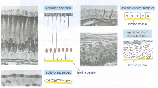 Nei foglietti epiteliali le cellule possono associarsi in vari modi. La fotografia al microscopio elettronico e le figure correlate mostrano quattro tipi fondamentali di epitelio. In tutti i tipi, le cellule sono distribuite su una sottile matrice extracellulare detta lamina basale (in giallo).