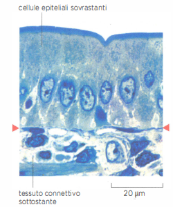 Le lamine basali danno sostegno ai foglietti epiteliali. Immagine al microscopio ottico dell’epitelio che riveste l’intestino tenue. Le cellule epiteliali poggiano su una sottile struttura, la lamina basale (punte di freccia rosse), un tappeto composto da un intreccio di collagene di tipo IV e laminine (proteine). La faccia inferiore della lamina interagisce con la rete di fibrille di collagene del tessuto connettivo sottostante.