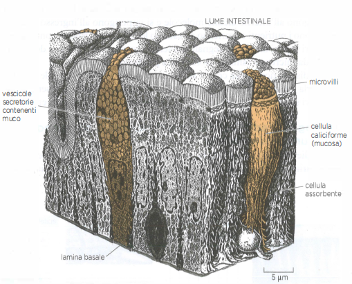 Il rivestimento intestinale è composto da cellule funzionalmente polarizzate. Nell’epitelio di rivestimento intestinale, le cellule assorbenti, che assumono le sostanze nutrienti dal lume dell’organo, sono mescolate alle cellule caliciformi (in marrone), che secernono il muco nel lume intestinale. Le cellule assorbenti sono dette anche cellule dall’orletto a spazzola, a causa dei microvilli che ne ricoprono la superficie apicale. La funzione dei microvilli è aumentare la superficie assorbente della membrana apicale per il trasporto di piccole molecole nella cellula. Le cellule caliciformi devono la loro forma alla massa di vescicole secretorie che fa distendere la regione apicale.