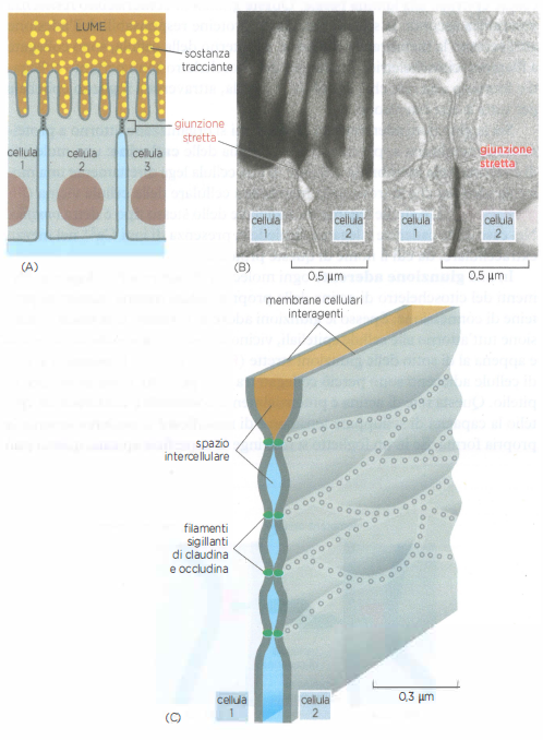 Grazie alle giunzioni strette, i foglietti epiteliali sono barriere selettive contro la libera diffusione dei soluti. (A) Questo disegno schematizza l’effetto delle giunzioni strette: le molecole di piccole dimensioni di un tracciante extracellulare (in giallo), deposte a un lato di un foglietto epiteliale, non riescono a passare tra le cellule. (B) Fotografia al microscopio elettronico di cellule di un epitelio in cui è stata iniettata una sostanza tracciante con una massa molecolare piccola (in colore scuro) sul lato apicale (a sinistra) o sul lato basolaterale (a destra); in entrambi i casi il tracciante è arrestato dalle giunzioni strette. (C) Un modello della giunzione stretta che mostra in che modo le cellule sono sigillate da filamenti ramificati di proteine transmembrana, dette claudine e occludine (in verde), situate nella membrana cellulare di cellule interagenti. Ogni tipo di proteina lega il suo omologo nella membrana adiacente (non visibile).