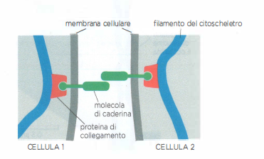 Le molecole di caderina formano connessioni meccaniche tra le cellule. Due molecole identiche di caderina, situate nelle membrane cellulari di due cellule adiacenti, stabiliscono un legame all’esterno della cellula. Sul versante citoplasmatico esse si collegano con i filamenti di actina o con i filamenti intermedi di cheratina del citoscheletro tramite proteine di collegamento. Quando le cellule entrano in contatto tra loro, le caderine si concentrano nei punti di adesione.