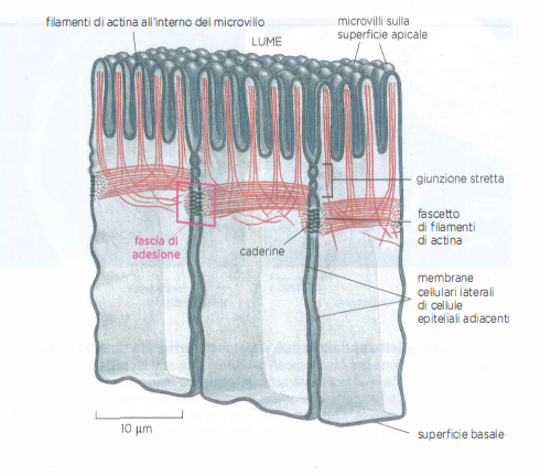 Nell’intestino tenue le giunzioni aderenti formano fasce di adesione che cingono le cellule epiteliali. Un fascetto contrattile di filamenti di actina decorre sulla faccia citoplasmatica della membrana in prossimità della porzione apicale di ogni cellula. I fascetti di actina di cellule adiacenti sono collegati l’uno all’altro mediante le molecole di caderina che attraversano la membrana da parte a parte.