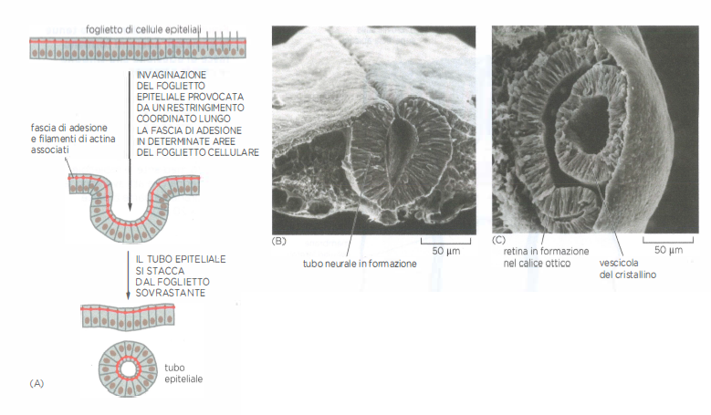 Un foglietto epiteliale può ripiegarsi, formando un tubo o una vescicola. La contrazione dei fasci apicali di filamenti di actina, collegati da una cellula all’altra mediante giunzioni aderenti, determina il restringimento degli apici delle cellule epiteliali. In funzione dell’orientamento della contrazione del foglietto epiteliale, lungo un solo asse o ugualmente ripartita in tutte le direzioni, l’epitelio potrà arrotolarsi formando un tubo o invaginarsi per formare una vescicola. (A) Disegno schematico che mostra come la contrazione apicale lungo un asse di un foglietto epiteliale possa portare alla formazione di un tubo. (B) Immagine al microscopio elettronico a scansione di una sezione trasversale del tronco di un embrione di pollo di due giorni, che mostra la formazione del tubo neurale secondo il processo descritto in (A). Parte del foglietto epiteliale che riveste l’epidermide si è arrotolata per contrazione apicale; le pieghe opposte sono sul punto di fondersi; in seguito la struttura si staccherà dall’epitelio per diventare il tubo neurale. (C) Immagine al microscopio elettronico a scansione di un embrione di pollo, che mostra la formazione del calice ottico e del cristallino. Un’area dell’epitelio superficiale che sta sopra il calice ottico in via di formazione ha prodotto una concavità e si è poi staccata dall’epitelio, formando all’interno del calice ottico una vescicola separata, la vescicola del cristallino. Questo processo è guidato da un restringimento apicale delle cellule epiteliali in tutte le direzioni.