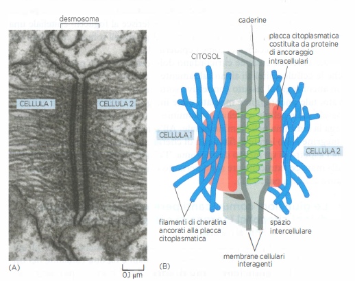 I desmosomi connettono i filamenti intermedi di cheratina di cellule epiteliali adiacenti. (A) Immagine al microscopio elettronico di un desmosoma che unisce due cellule epidermiche di un tritone; sono visibili i filamenti di cheratina che si attaccano al desmosoma. (B) Disegno schematico di un desmosoma. Sulla faccia citoplasmatica di ciascuna delle due membrane cellulari interagenti si trova una placca densa, composta da un complesso di proteine intracellulari di ancoraggio; sulla superficie di ogni placca si inserisce un fascio di filamenti di cheratina. Le estremità citoplasmatiche della caderina legano la faccia esterna di ogni placca; l’interazione dei loro domini extracellulari tiene unite le due cellule.
