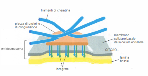• Emidesmosomi: integrine basali (ad esempio α6β4) che legano laminina nella lamina basale e si connettono ai filamenti di cheratina mediante plectina e proteine affini.