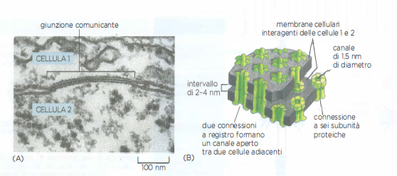 Le giunzioni comunicanti stabiliscono una comunicazione diretta tra cellule vicine. (A) Immagine al microscopio elettronico di giunzioni comunicanti tra due cellule in coltura in sezione ultrasottile. (B) Un modello di giunzione comunicante. Il disegno mostra le membrane cellulari interagenti di due cellule adiacenti. I due doppi strati lipidici giustapposti sono attraversati da aggregati proteici detti connessoni (in verde); si ritiene che ciascun connessone sia formato da sei subunità proteiche identiche. Due connessoni, unendosi nello spazio intercellulare, formano un canale acquoso che collega i citoplasmi delle due cellule.